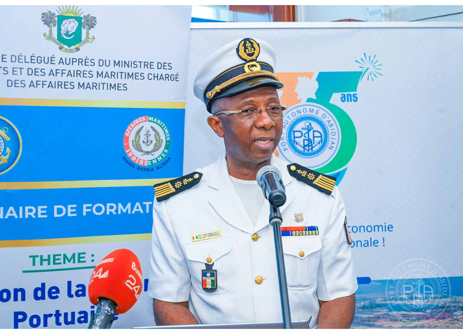 La cérémonie a été présidée par le Directeur de Cabinet du ministre délégué auprès du ministre des Transports et des Affaires Maritimes, chargé des Affaires Maritimes, M. Benjamin SORO, représentant son Ministre, Dr Célestin DOH. Elle s’est tenue en présence de plusieurs autorités, notamment le Directeur Général des Affaires Maritimes, le Colonel-major Julien Yao KOUASSI, le Directeur des Opérations Maritimes, de la Sécurité et de l’Environnement (DOMSE), le Colonel COFFI Yao Emmanuel, ainsi que le Directeur Commercial, Marketing et de la Communication, Dr Titi PALÉ épouse KOUMAN.