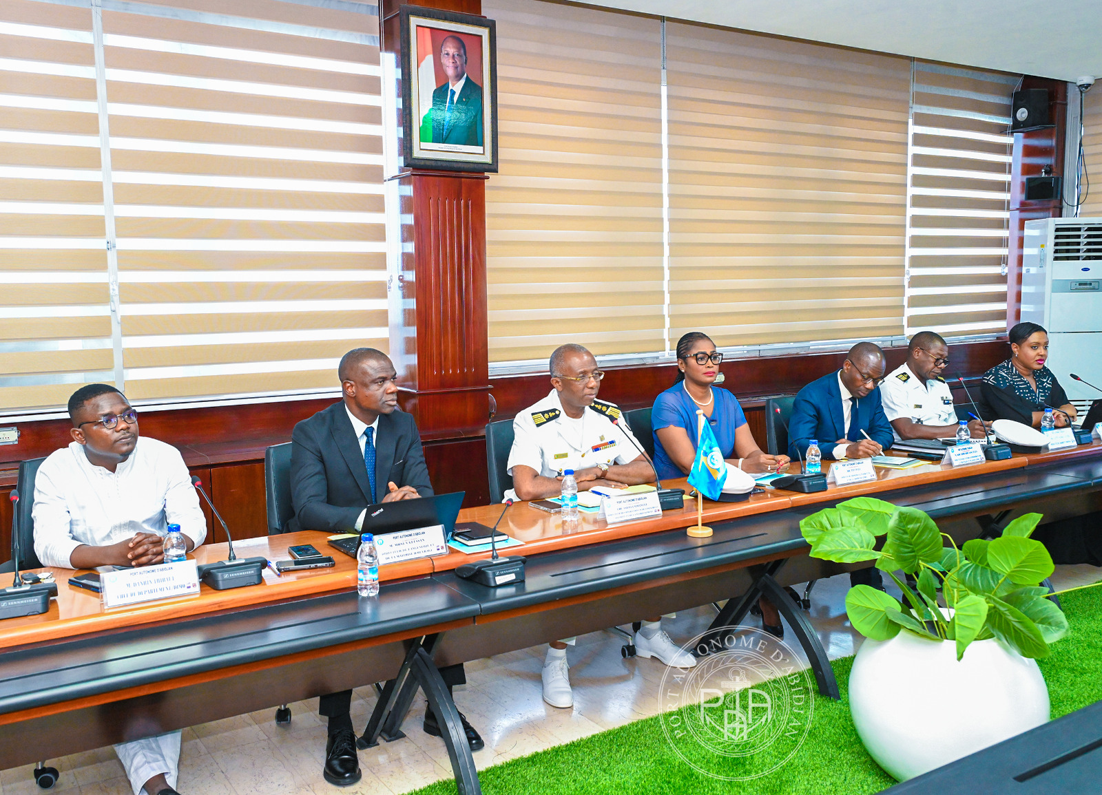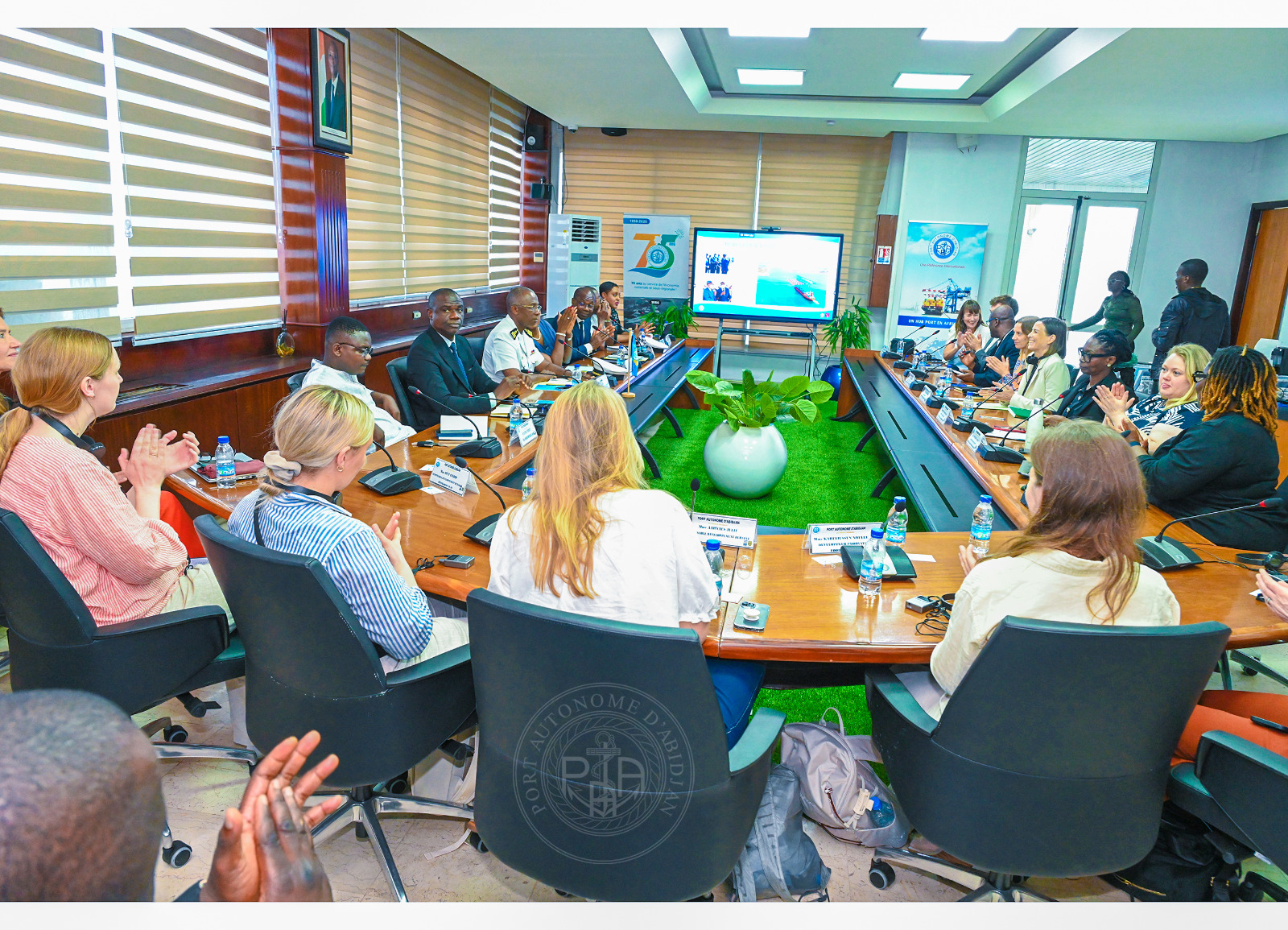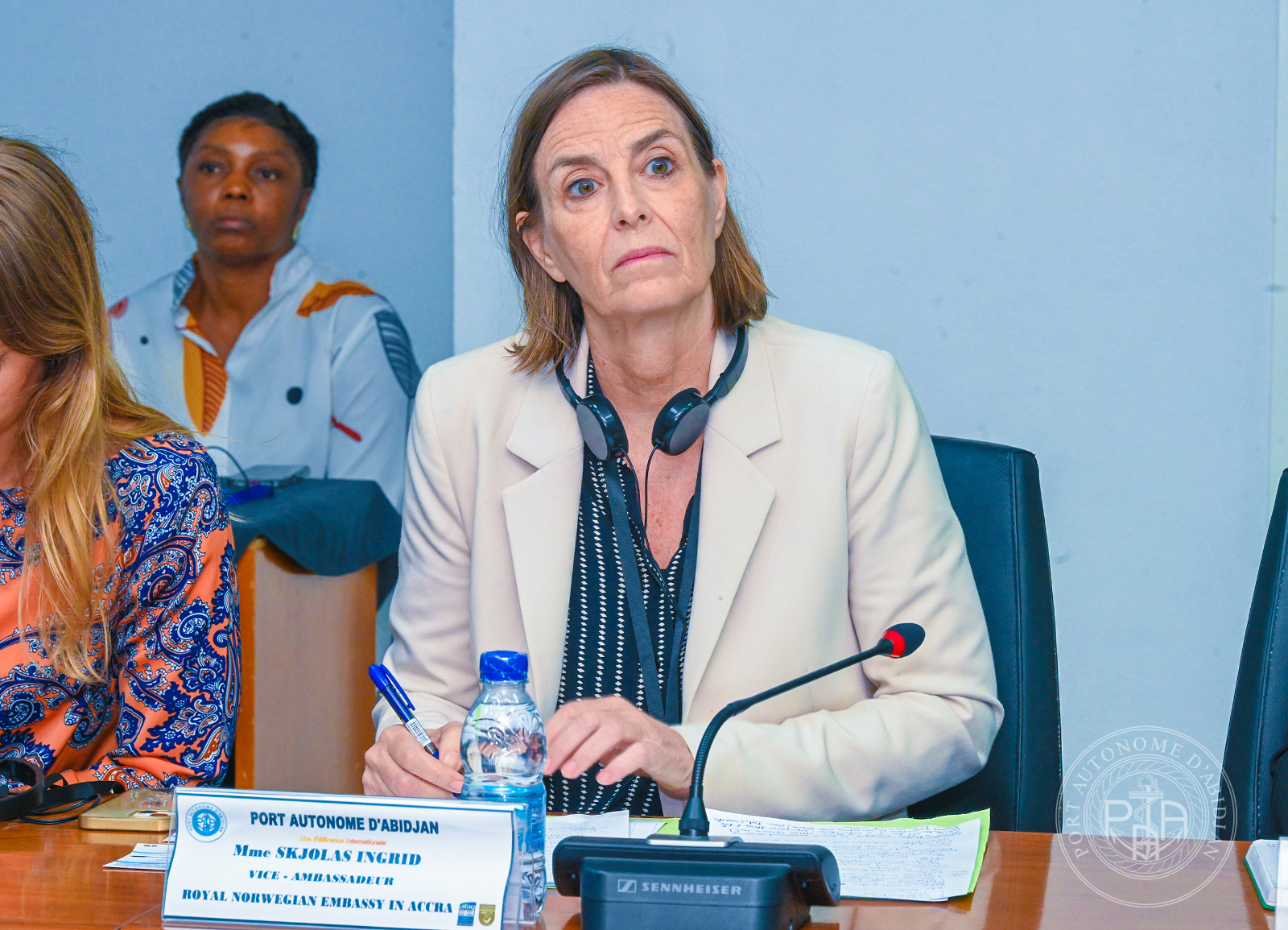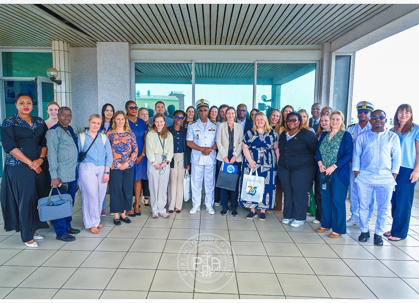 La délégation avec à sa tête, Mme Ingrid SKJOLAS, vice-Ambassadeur du Royaume de Norvège à Accra (Ghana), et conduite par Madame Antoinette BOTTI, Consul honoraire du Royaume de Norvège en Côte d’Ivoire, a été reçue par le Colonel COFFI Yao Emmanuel, Directeur des Opérations Maritimes, de la Sécurité et de l’Environnement (DOMSE), par ailleurs Commandant du port d’Abidjan, en présence de Dr Titi PALÉ Épse KOUMAN, Directrice Commerciale, Marketing et de la Communication (DCMC), de M. Hyacinthe MONI, Directeur de l’Ingénierie et de la Maîtrise d’Ouvrages (DIMO), et de M. Jules KOUADIO, Directeur des Études Économiques, de la Stratégie et de la Planification (DEESP).