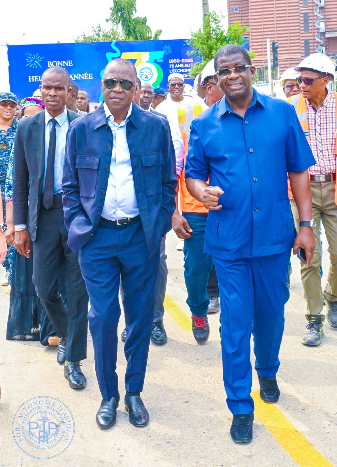Accompagné du Directeur Général du Port Autonome d’Abidjan, M. Hien Yacouba SIE, et de la Directrice Générale de l’Agence Américaine du Millénium Challenge Account Côte d’Ivoire (MCA), Mme Marie-Viviane ADO GOSSAN COULIBALY, le Ministre a exprimé sa satisfaction quant à la qualité des travaux et a encouragé l’entreprise chargée des travaux à respecter les délais impartis.